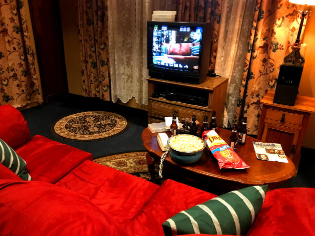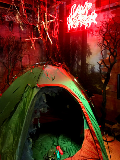 The first room was an impressive homage to Scream. There was a setup inspired by the unforgettable opening scene where the villain makes his first kill. Who can forget the exploding popcorn Casey leaves on the stovetop as she’s harassed on the phone? In the same space was a living room where you can sit and watch yourself on the TV screen…creepy. You can really go crazy taking pictures in this area, and a staff member helped my husband and me get a fun shot.