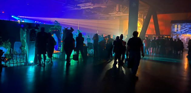 I couldn’t leave without heading to the lower level once more to check out the Hall of Shadows. This is where haunters set up mini versions of their haunts to give attendees a sneak preview of what’s to come during the fall season. To enhance the creepy atmosphere in this area, it’s completely dark (except for glowing neon lights), fog permeates every corner and morbid music resounds from speakers. It’s the epitome of a Halloween village. Lines were lengthy for every attraction and my vampire energy was drained, so I didn’t walk through any of them, but I did survey the selection and captured images of the exteriors. They all looked quite promising.
