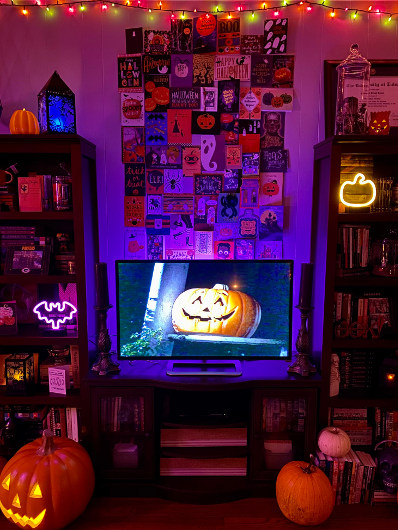 For the past few years, I’ve used my TV stand as the focal point for my décor. I don’t like doing the same thing twice so that changes year to year. One year, I used a Halloween countdown calendar as the centerpiece. The next year, it was throwing literally every die cut I had up on the wall. In 2020, I made a collage on the wall above the TV using a bunch of the Halloween cards I’ve received from readers over the years. In 2021, I twisted crepe paper to look like it was coming from inside a witch hat hanging from the ceiling to fill the space, and I loved how that turned out.